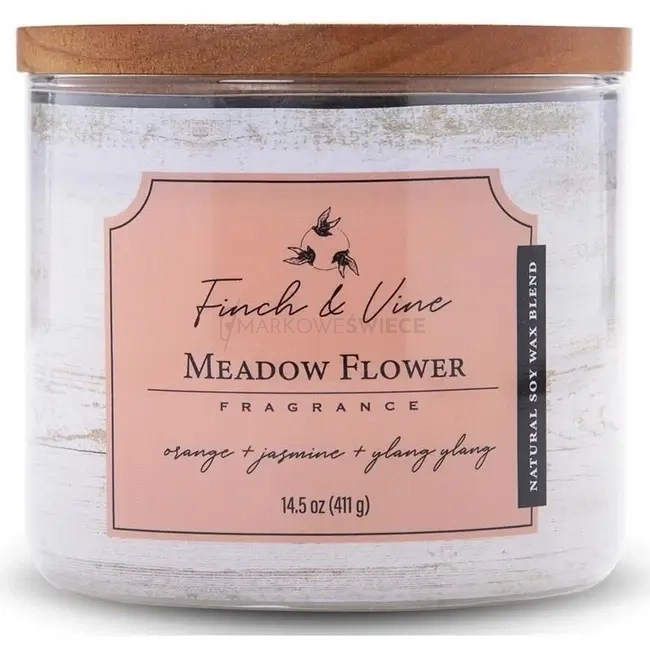 Zapach dużej świecy sojowej Meadow Flower od Colonial Candle z kolekcji Finch & Vine przenosi w rustykalne, wiejskie klimaty, wprowadzając do wnętrza atmosferę świeżości i harmonii. Elegancka świeca w okrągłym szkle z trzema knotami oraz drewnianą przykrywką, inspirowana naturą, idealnie komponuje się z nowoczesnymi i klasycznymi wnętrzami.